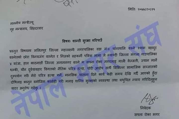 त्यस पश्चात सपनाले आफ्नो सुरक्षाकाे लागि बस्नेत विरूद्ध अभद्र व्यवहार मुद्दामा आइतबार महानगरीय प्रहरी परिसरमा जाहेरी दिएकी थिइन्।