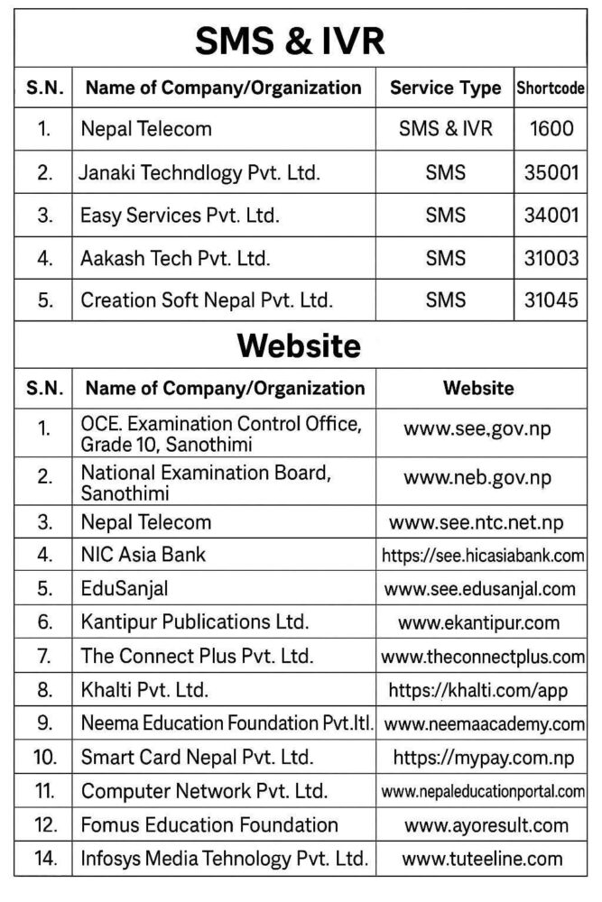एसएमएस र आईभीआरमा नेपाल टेलिकम, जानकी टेक्नोलोजी, आकाश टेक, स्विफ्ट टेक्नोलोजी, अल स्टार आईटी सोलुसन्समार्फत हेर्न सकिनेछ ।