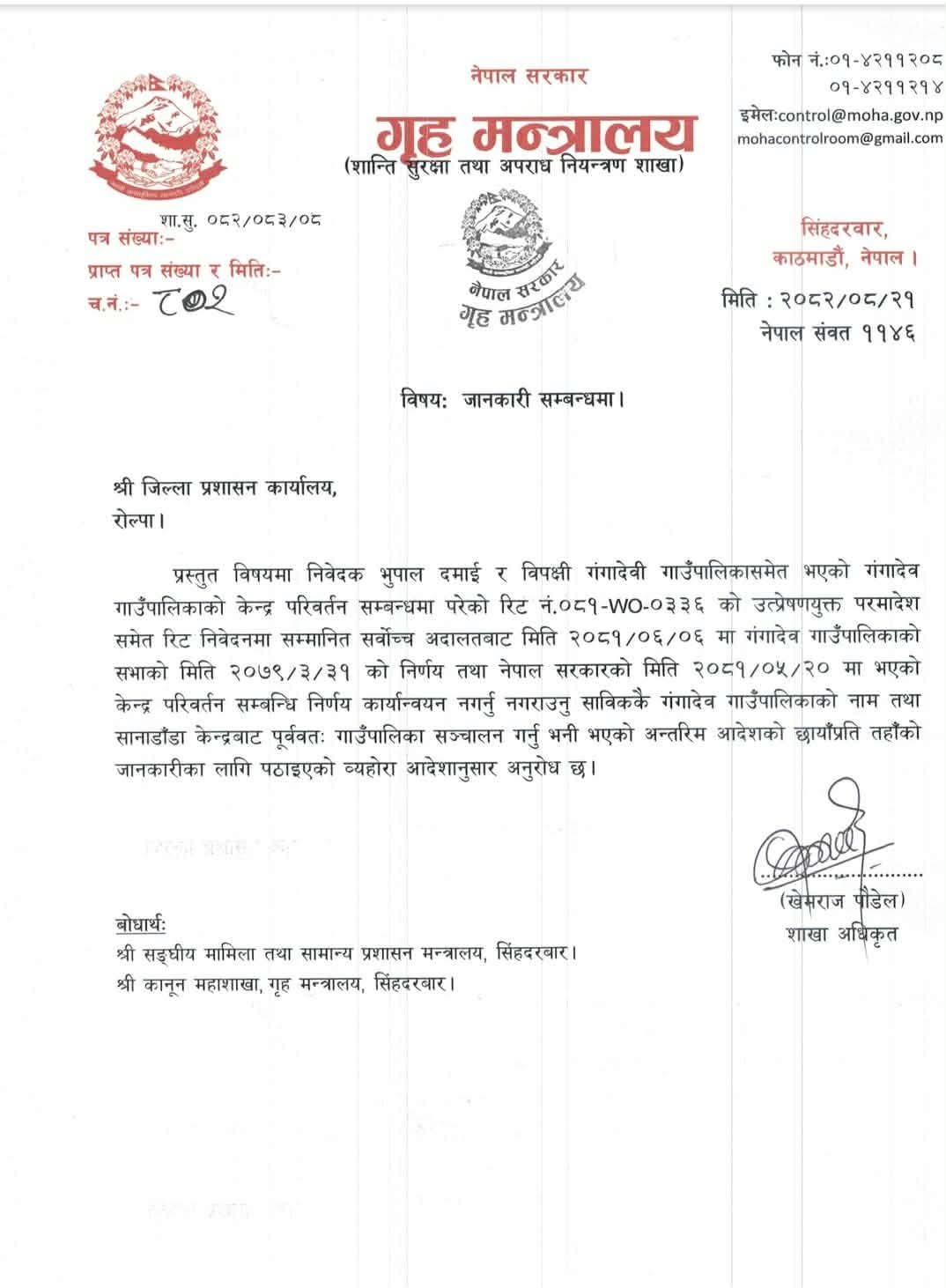 राेल्पा- गंगादेव गाउँपालिकाको केन्द्र परिवर्तनसम्बन्धी मुद्दामा गृह मन्त्रालयले स्पष्ट निर्देशन दिंदै गाउँपालिकाको नाम र प्रशासनिक कार्य पुरानै स्थानबाट संचालन गर्न निर्देशन दिएको छ।