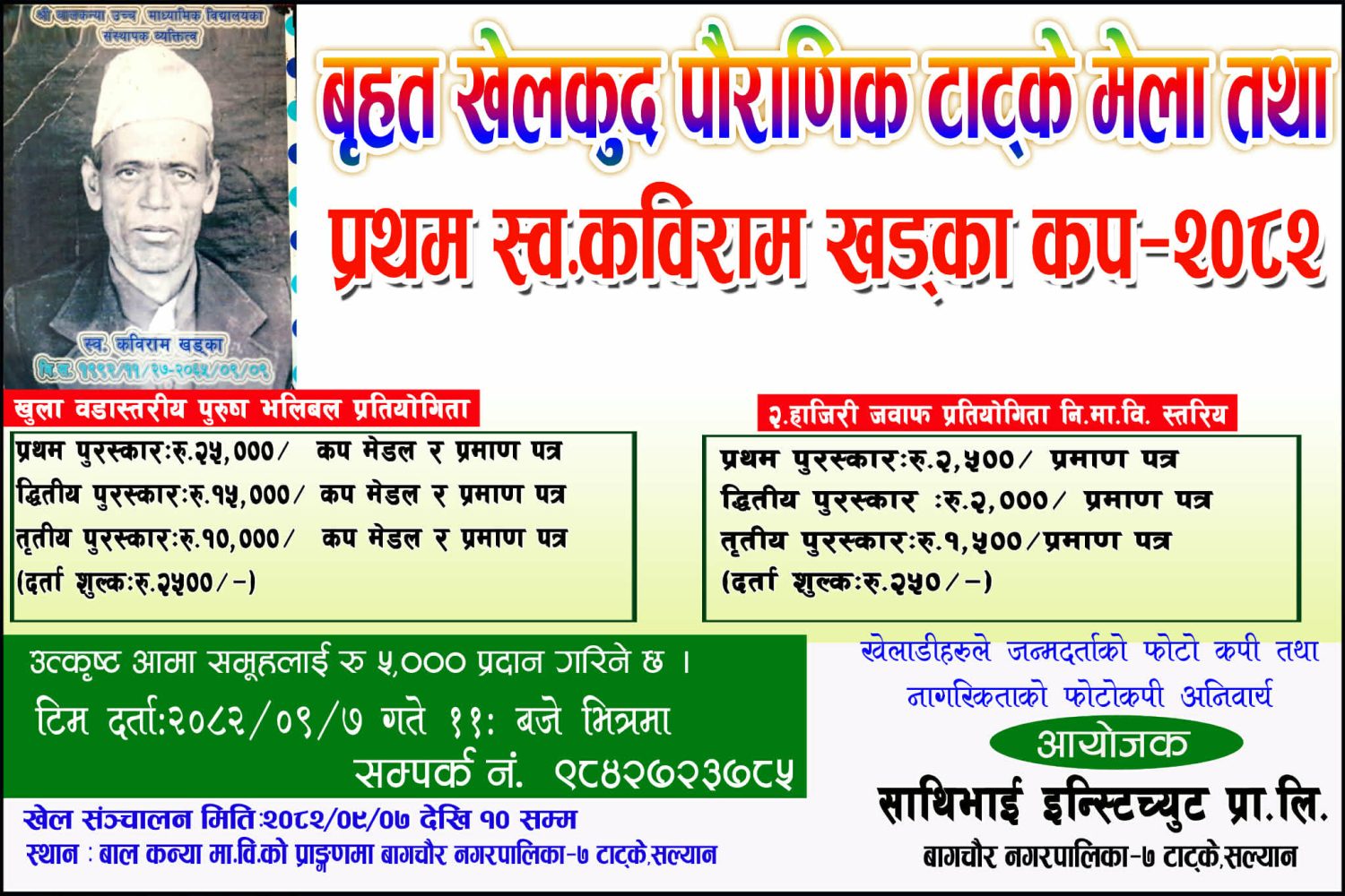 सल्यान – बागचौर नगरपालिका–७ टाट्के, सल्यानमा ‘बृहत खेलकुद पाैराणिक टाट्के मेला तथा प्रथम स्व. कबीराम खड्का कप–२०८२’ आयोजना हुने भएको छ । स्व. कबीराम खड्काको सम्झनामा आयोजना गर्न लागिएको प्रतियोगिता यही २०८२/०९/०७ गतेदेखि १० गतेसम्म हुने आयोजक साथिमाई इन्स्टिच्युट प्रा.लि. ले जनाएको छ ।