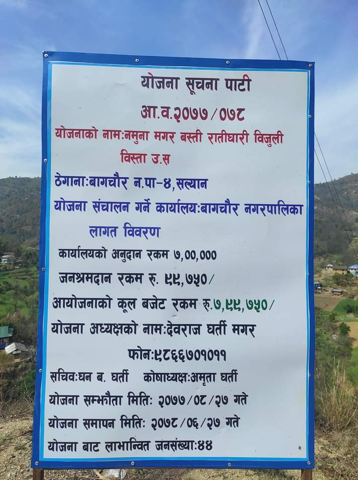 फागुन २४ सल्यान – बागचौर नगरपालिकाले पाँच वर्षको अवधिमा सम्पन्न गरेका र हुँदै गरेका विकास योजनाहरुको प्रारम्भिक विवरण सार्वजनिक गर्नेक्रममा वडा नं.४ को विवरण पनि सार्वजनिक गरेको छ ।