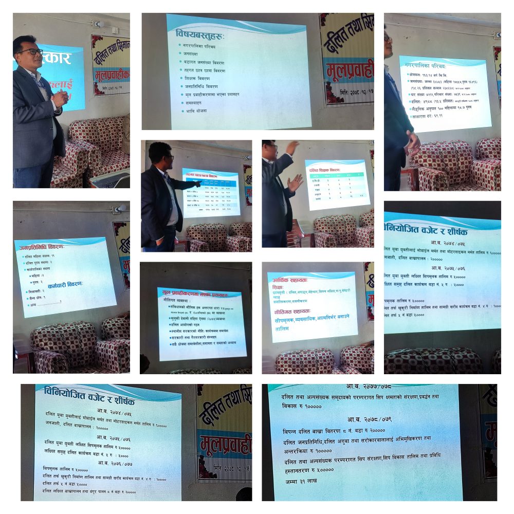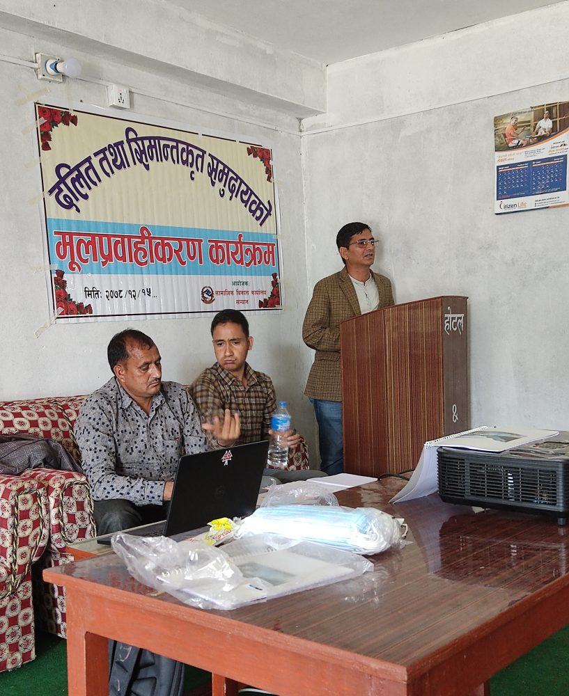 सामाजिक विकास कार्यालय सल्यानका पाँचौ तहमा कार्यरत कर्मचारी हरिप्रसाद सापकोटाले सहजीकरण गरेको कार्यक्रममा विभिन्न विद्यालयका प्र.अ., शिक्षक, विभिन्न विद्यालयका दलित विद्यार्थी, अभिभावक लगायतको उपस्थिति रहेको थियो ।