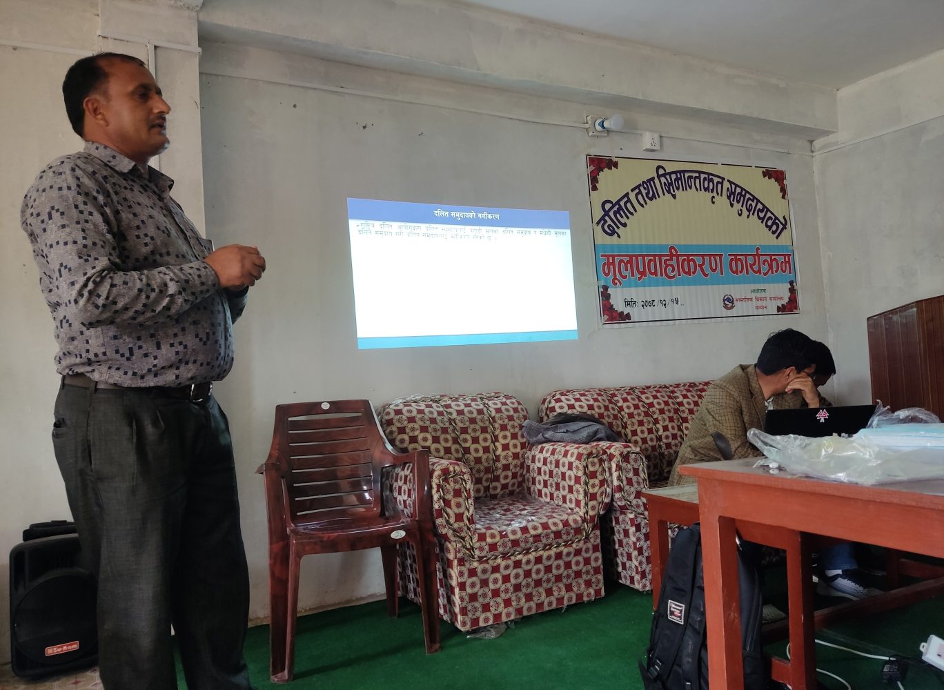 त्यस्तै प्रशिक्षक जिल्ला सरकारी वकिक कार्यालय, सल्यानका न्यायाधिवक्ता दिल प्रसाद धिताले दलित समुदायका लागि कानुनमा भएका आर्थिक, सामाजिक, सांस्कृतिक, शैक्षिक लगायतका क्षेत्रमा भएका सम्पुर्ण ऐन, नियमको बारेमा प्रष्ट पारेका थिए । उनले दलित समुदायको वर्गीकरण, दलित समुदायको मुलप्रवाहीकरण,दलित समुदायको मुलप्रवाहीकरणको लागि राज्यले संविधान तथा अन्य कानुनमा गरेका व्यवस्थाहरु, संचालित कार्यक्रमहरुको विषयमा प्रशिक्षण दिएका थिए ।